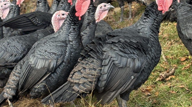Free range organically reared turkeys are available for Christmas. Day old poults are lovingly reared by Darrell & Ffion at Rhydhalog. They are allowed to roam freely from approx 6 weeks returning to a secure shed at night. We can supply whole turkeys, crowns ( legs and thighs removed from the carcass), butterflied - just breast meat tied up with string or thighs / legs and carcasses for stock. Whole turkeys weight start at 4.5 kg ( 10-12lb ) up to 10kg ( 20lbs+ )